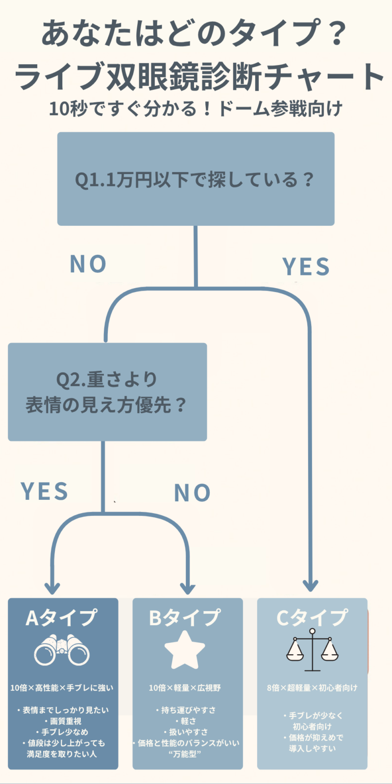 そこでまずは、YES/NOで進むだけで自分に合うタイプが分かる “双眼鏡診断チャート” を用意しました👇