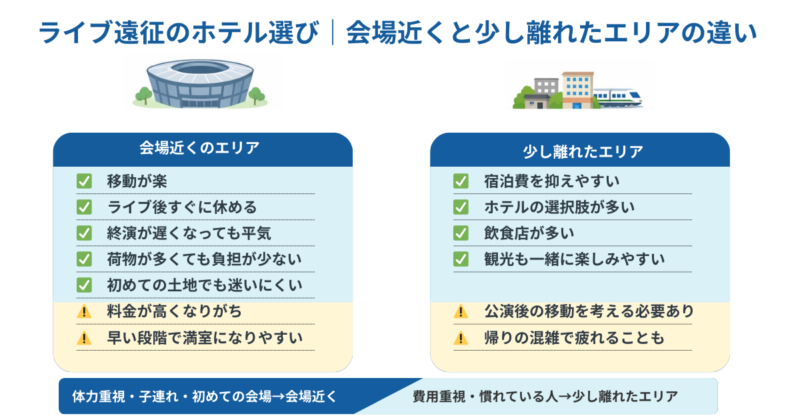 ここでは、会場近くと少し離れたエリア、それぞれのメリット・デメリットを整理しました。