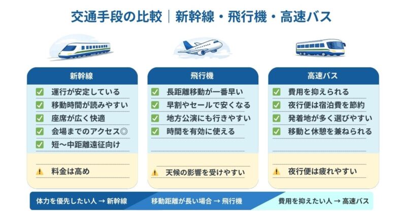 - 体力重視・子連れ・初めての会場 → 会場近くが安心